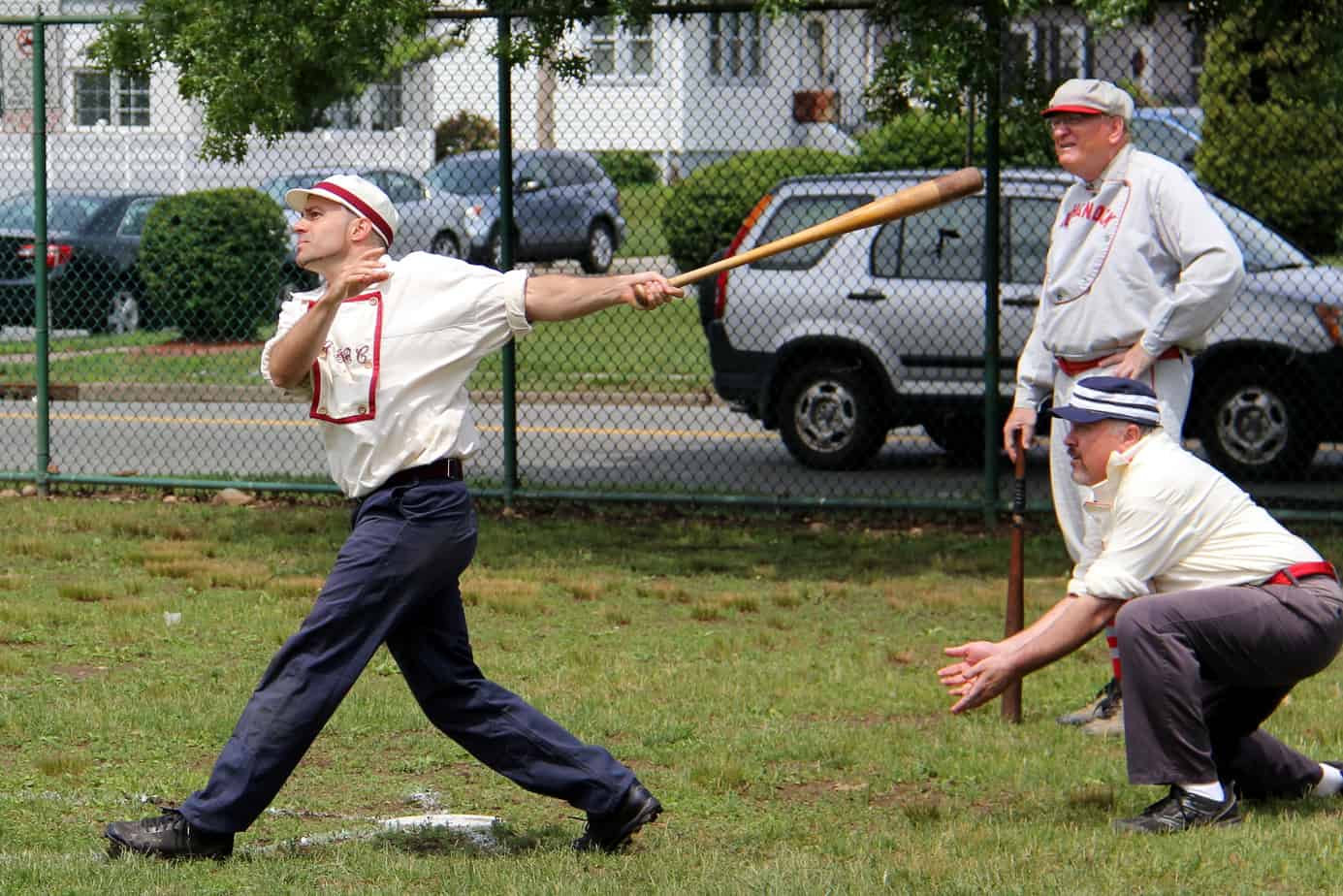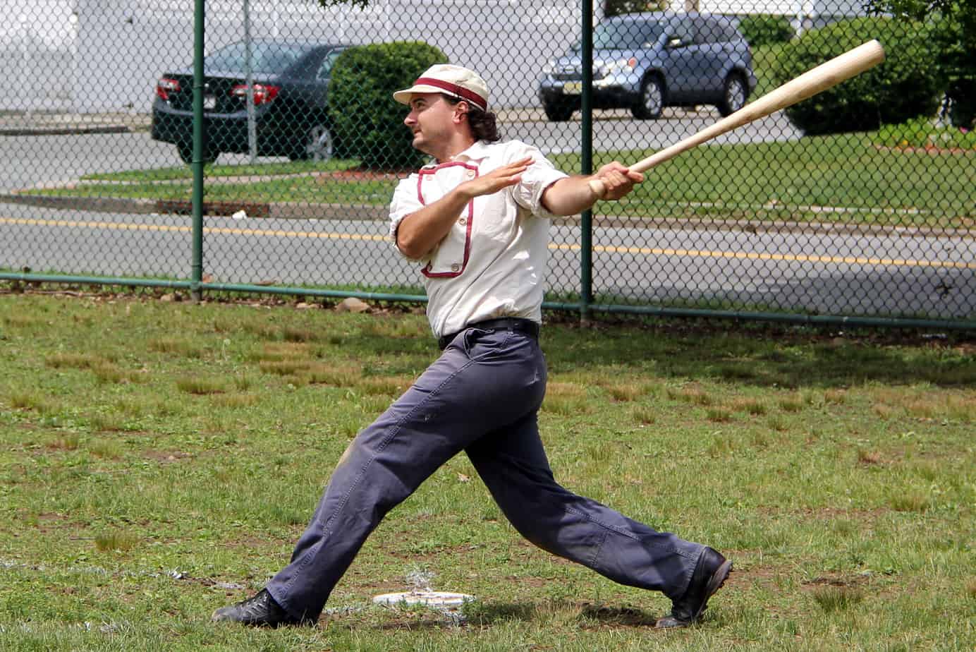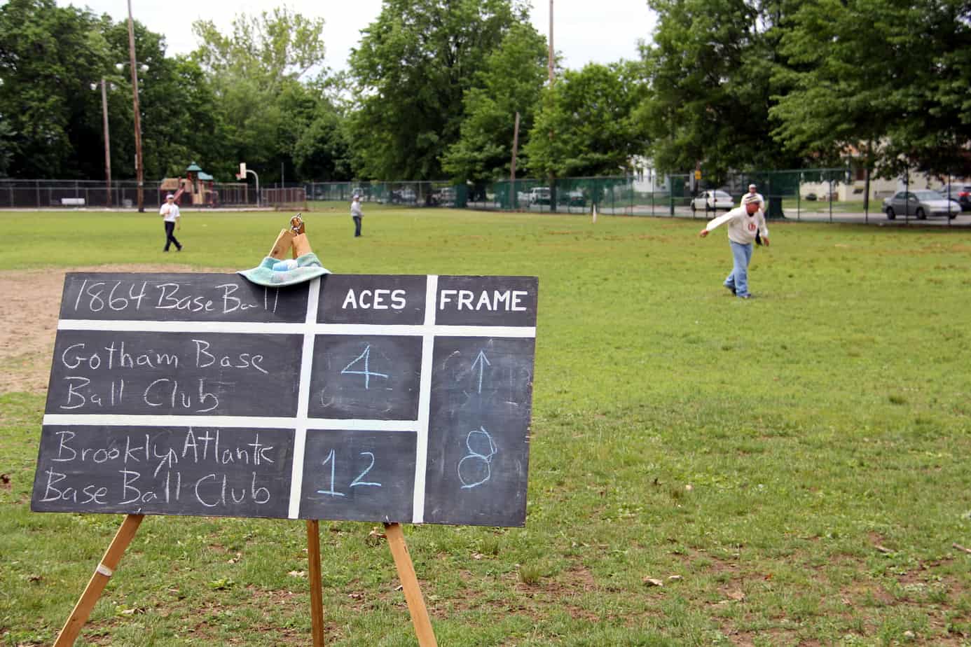 A couple weeks ago, we traversed the Passaic in the morn to join the bugs and cranks for a base ball match between the Atlantics of Brooklyn and the Gothams of New York held on the grounds in Paterson. T’was a merrie affair played under 1864 rules and featuring great displays of athletic prowess. The Atlantic Base Ball Club struck many successful hits — stingers, daisy cutters, banjo hits and cloud hunters — during the first frame, tallying several aces to take a big lead. But the ballists of the Gotham Base Ball Club of New York were resolute, recording a few aces of their own and slowing the strikers of the Atlantics. In the end, the Atlantics prevailed, 12-4. (They also triumphed in a second game, which we did not attend, 21-9.)